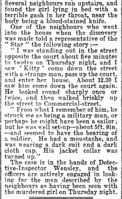 When I went upstairs I saw Kitty was lying in bed fully clothed. There was blood on the bedclothes. The room did not appear to have been disturbed in any way and there were no signs as if there has been a struggle. It looked to me as if she had been strangled first, and then her throat cut afterwards. On the floor I saw an ugly looking knife with blood on the it. It was a pocket knife but the blade was a thin one. I should think it was about three and a half inches long. The point of the knife was about half an inch in length. At the time of the crime the court was quite deserted. You can hear everything in the ordinary way, but nobody heard a sound or a scream. The only sound was the footfalls of a man coming out of the court. One of the neighbours I believe heard the sound of footsteps coming down the stairs, but nothing else."