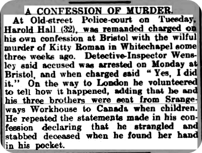 Wensley and Caban took Hall up to London, and Hall used the trip as an opportunity to tell them his life story, uncaring of their warning that anything he said could and would be used in court. He had no friends in the UK, he told them, as he and his three brothers had been sent to Canada from Manchester's Strangeways Workhouse as children. Born in 1882, Hall became a sailor and in Johannesberg was robbed of £30 by a French prostitute. "I didn't do anything to her," he told Wensley, "but I made up my mind, if it occurred again, what I would do." From Spain he worked his passage on the SS Thelma to arrive in Liverpool on October 22nd 1908. He soon made his way to London, where he went to the Seamen's Hospital suffering from rupture. About six weeks before the murder he began working at the Salvation Army Shelter in Bermondsey. He quit the very day of the murder, spending the evening at the Shoreditch Empire which he left some time before midnight.