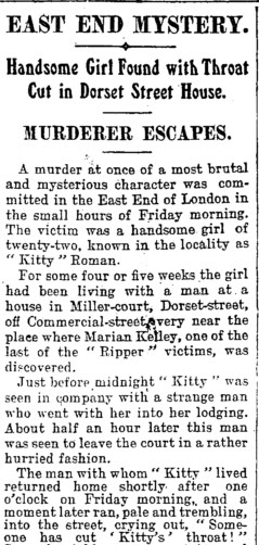 Rose Duckwell, a 20-year-old flower seller, told the coroner's inquest she had seen a woman matching Kitty's description just before midnight, sitting on a step in Shoreditch. Two yiddish looking lads put their arms around her waist, but she walked away.