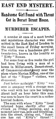 On Kitty's lifestyle, Benstead said that he had heard she was an unfortunate, but that he had not seen her in the company of other men. She was not earning any money, so far as he knew, as he went out to support her. DI Wensley asked him at the inquest: "Would you be surprised to know you are the only person in Miller's Court who does not know the deceased was an unfortunate?" Benstead's answer was: "Well, many people told me, but if I took notice of what they said there would always have been rows down there." (Wensley is said to have been implying that, actually, Benstead was a ponce - in 1909 another word for 'pimp'.)