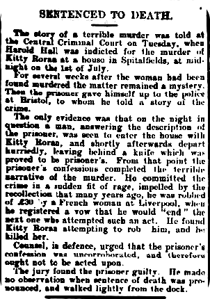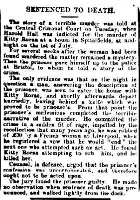At some point after arriving back in London Wensley had Alfred Wilkins called to the police station, where he identified Hall as the man he had seen with Kitty from a line up of 7 or 8 men in the yard. He appeared before Old Street Police Court on July 20th and was remanded for a week. The Western Daily Mail of July 21st reported: "The accused, a tall, dark young fellow, appeared much distressed as he entered the dock, and was charged on his own confession with murder." He went back before the police court on the 27th and this time retracted his confession, though was still committed for trial.